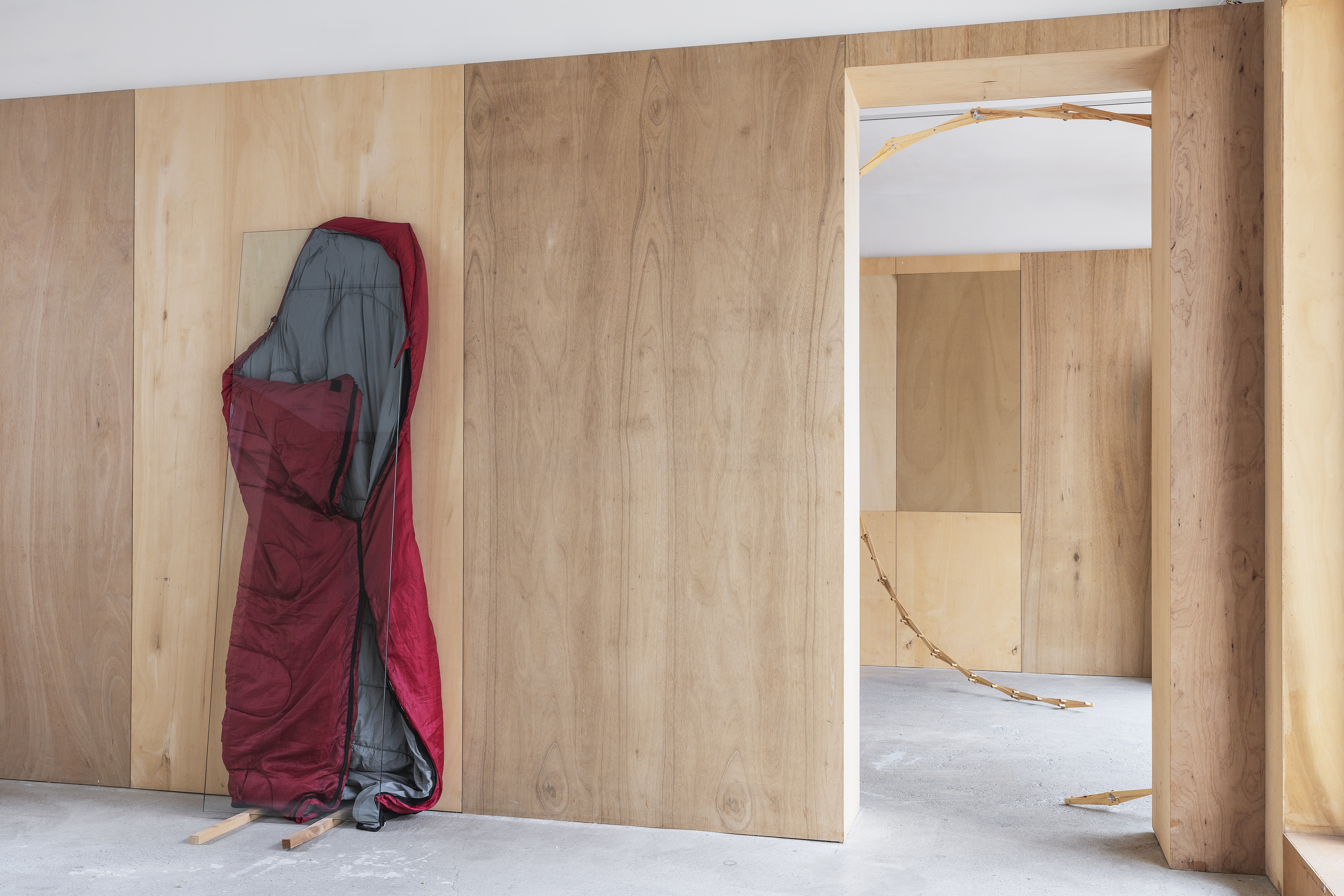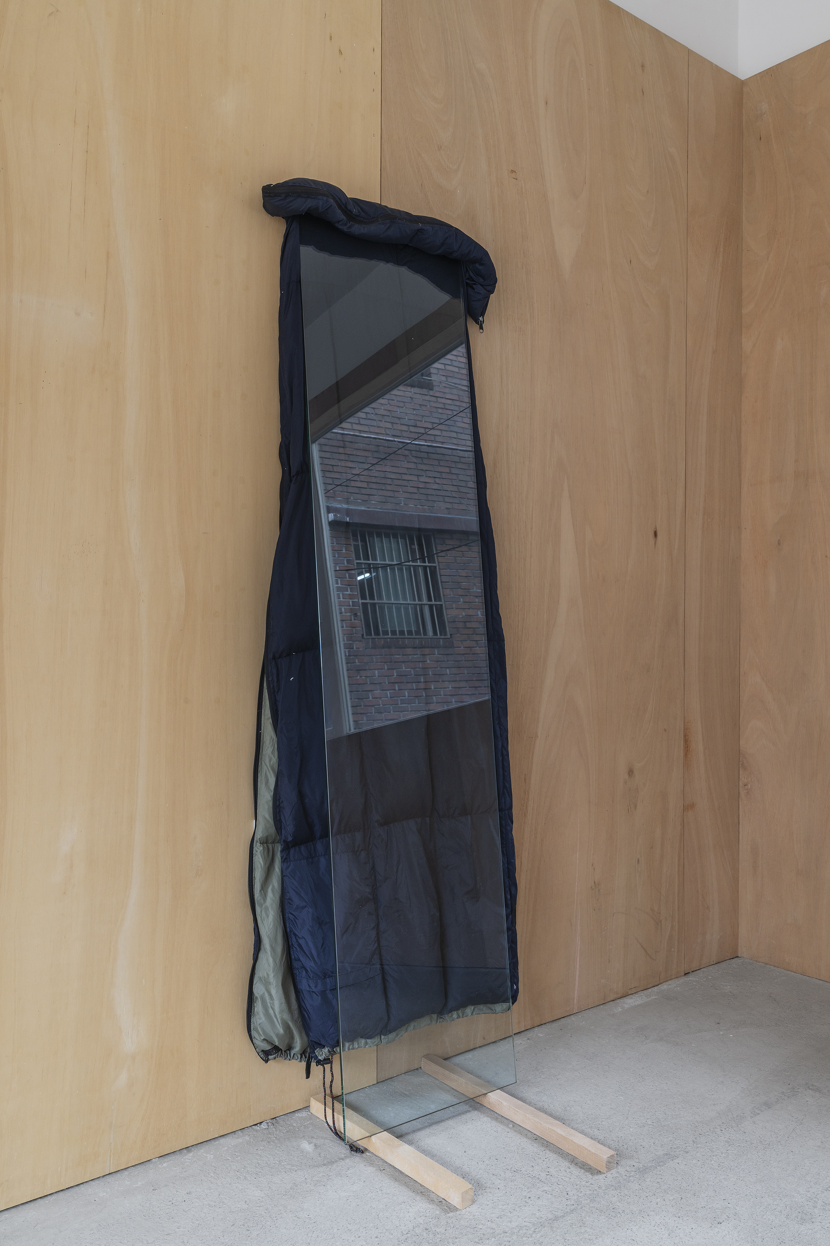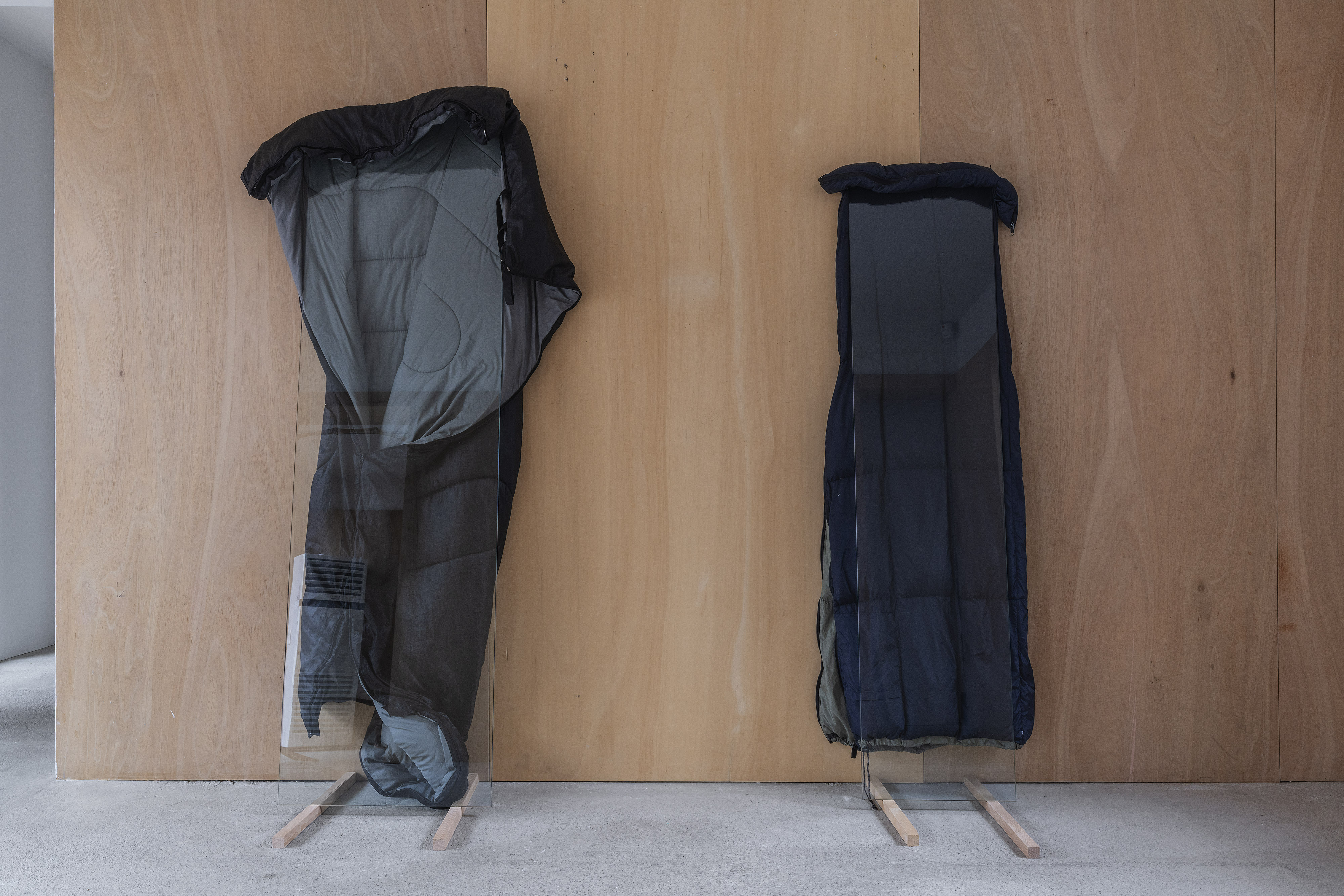 sleeping bag, glass, wood lath, each 90x47x194cm, 50x52x173cm, 74x50x194cm