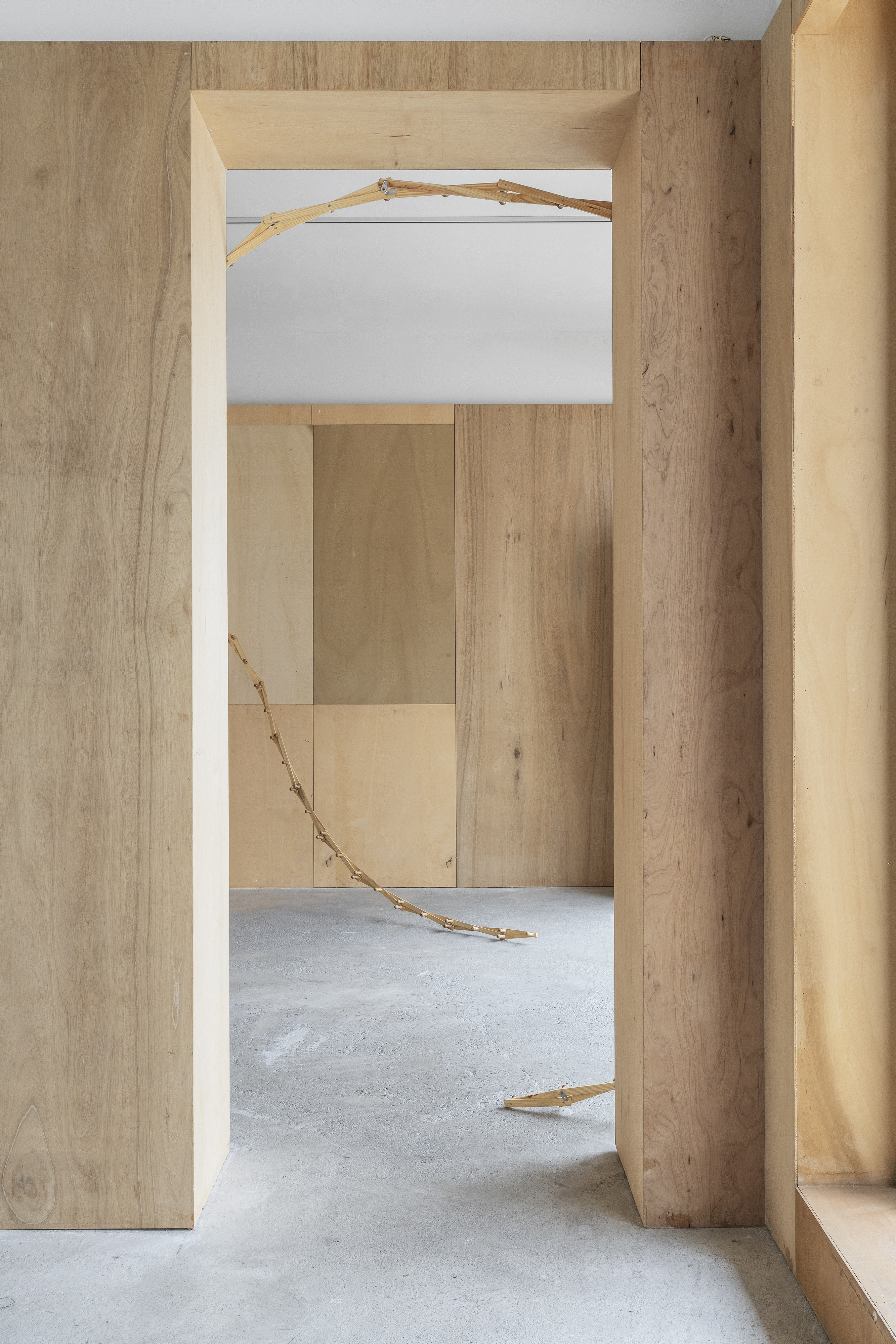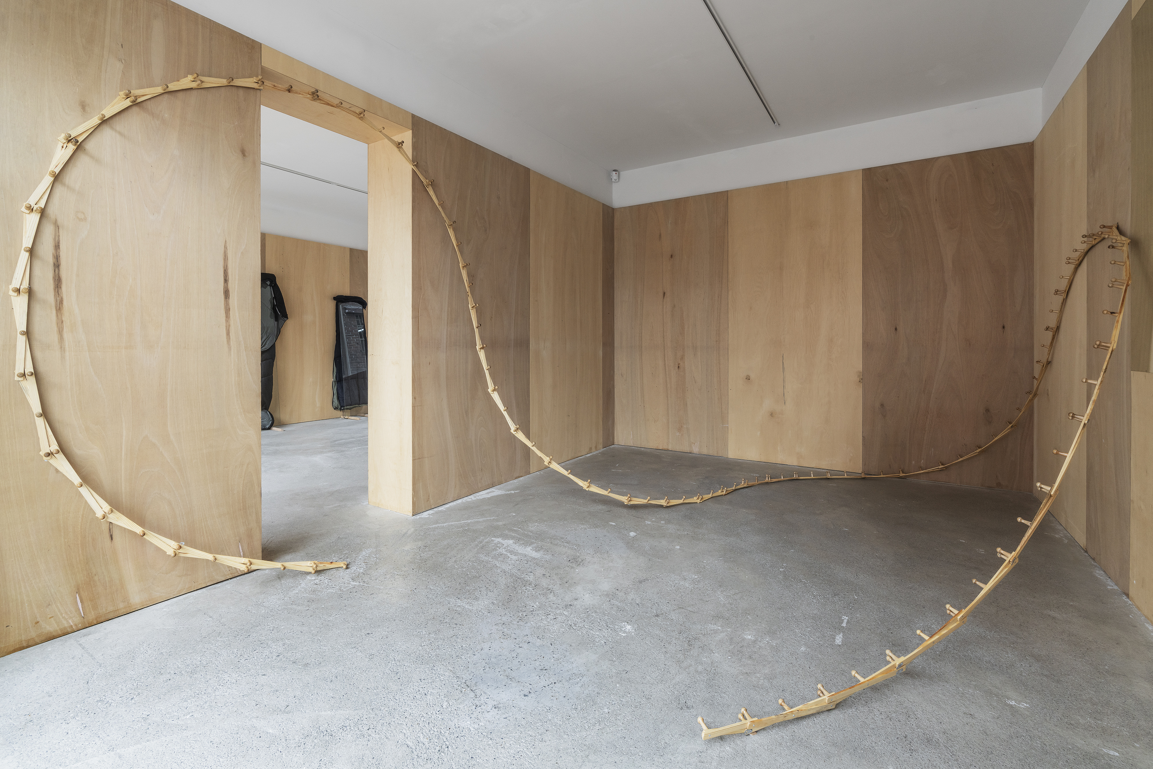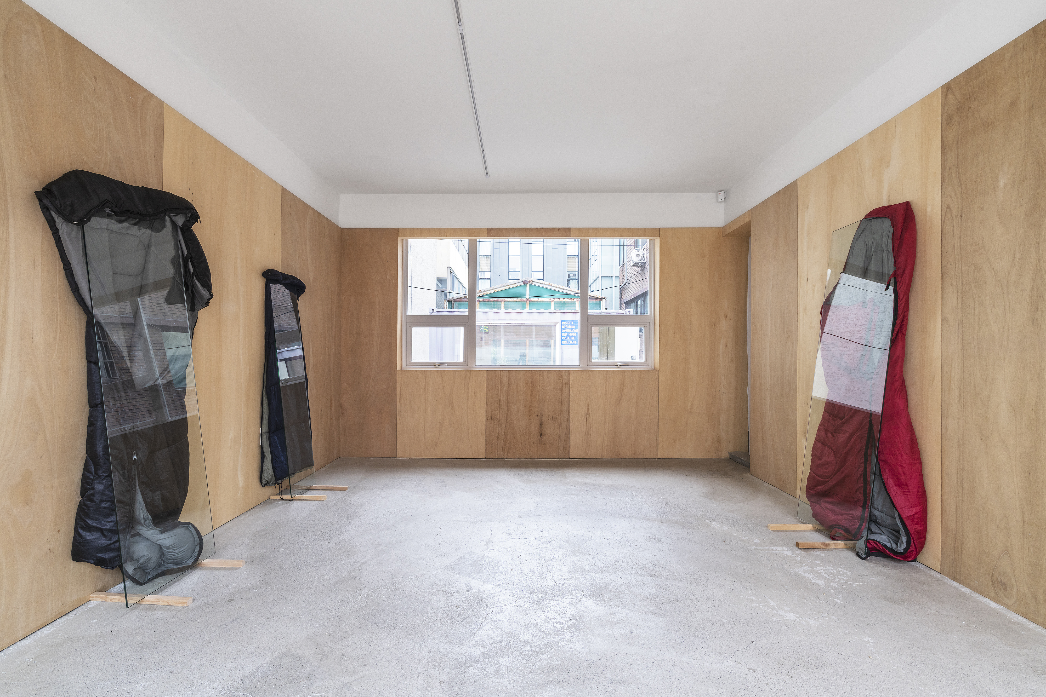 sleeping bag, glass, wood lath, each 90x47x194cm, 50x52x173cm, 74x50x194cm