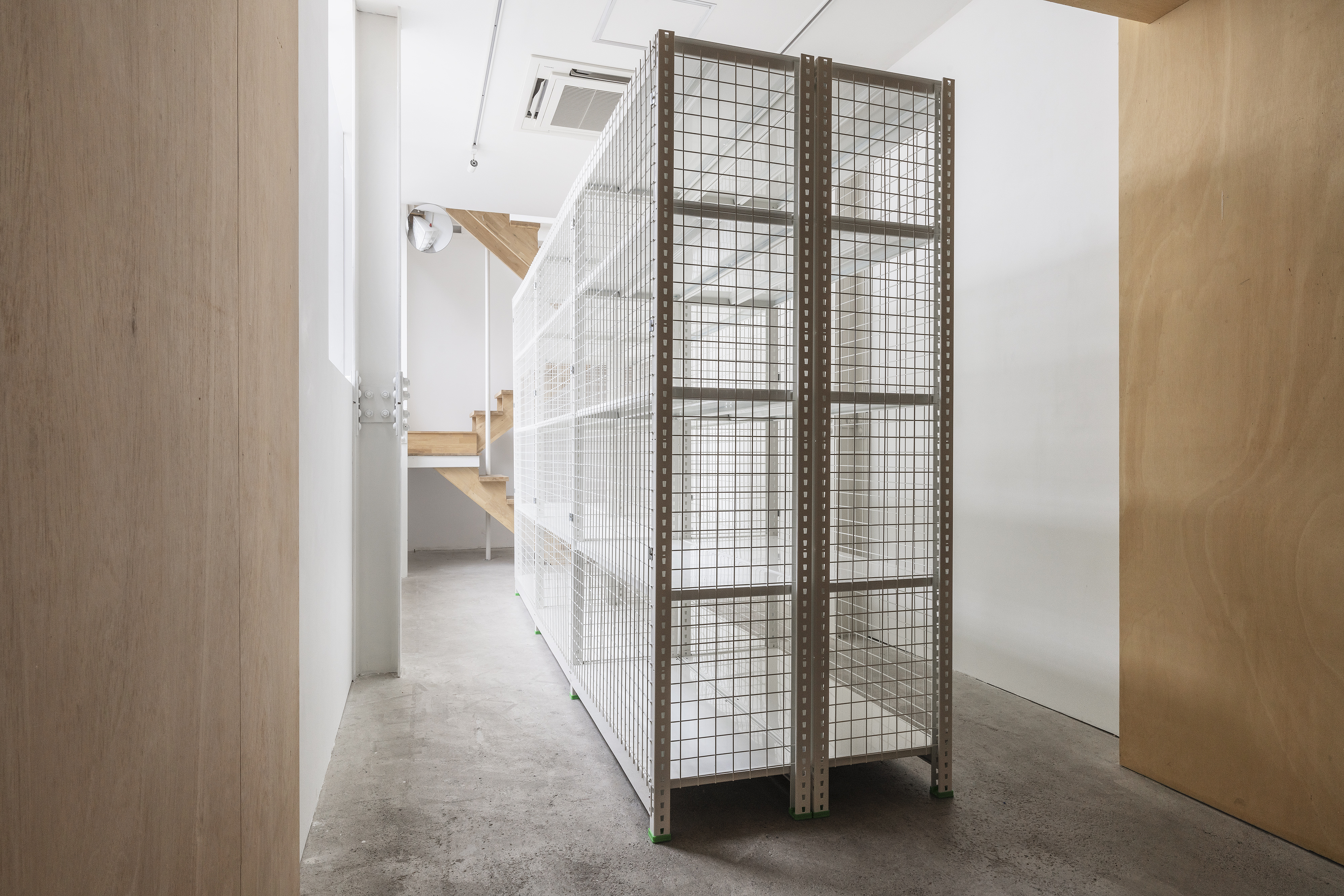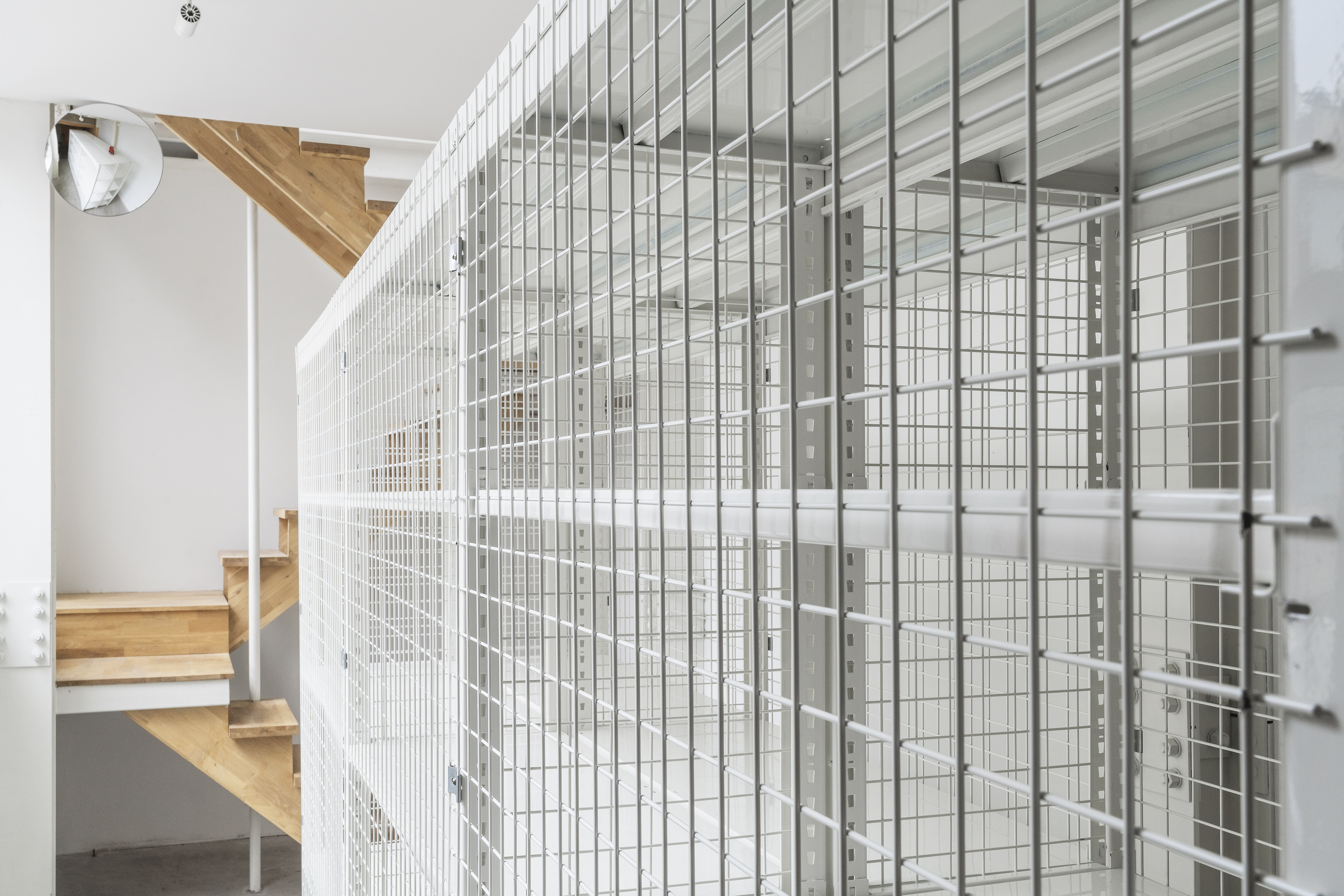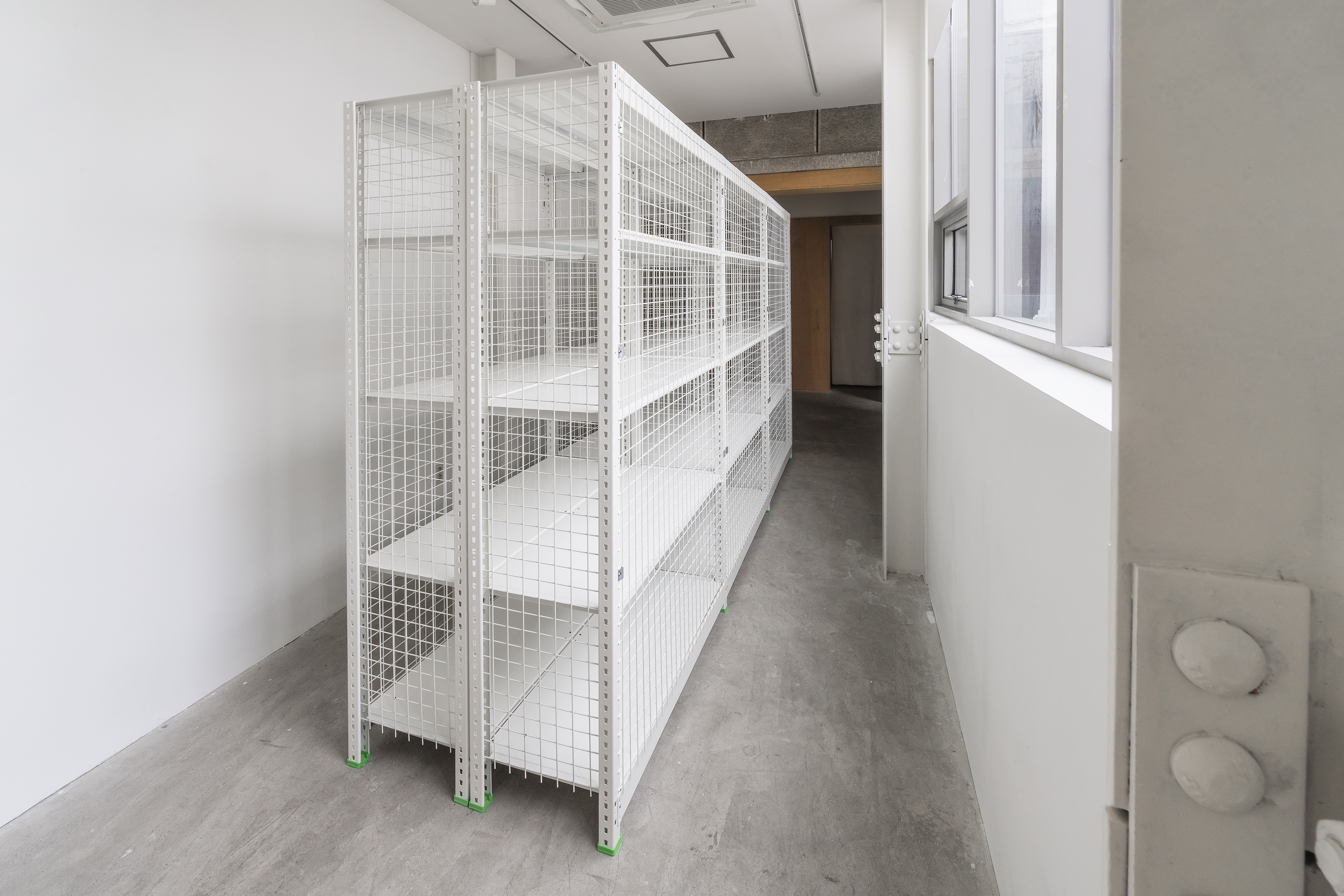 storage rack 90(w)x370(d)x220(h)cm, observation mirror (ø40cm),fire extinguisher, installation, dimensions variable